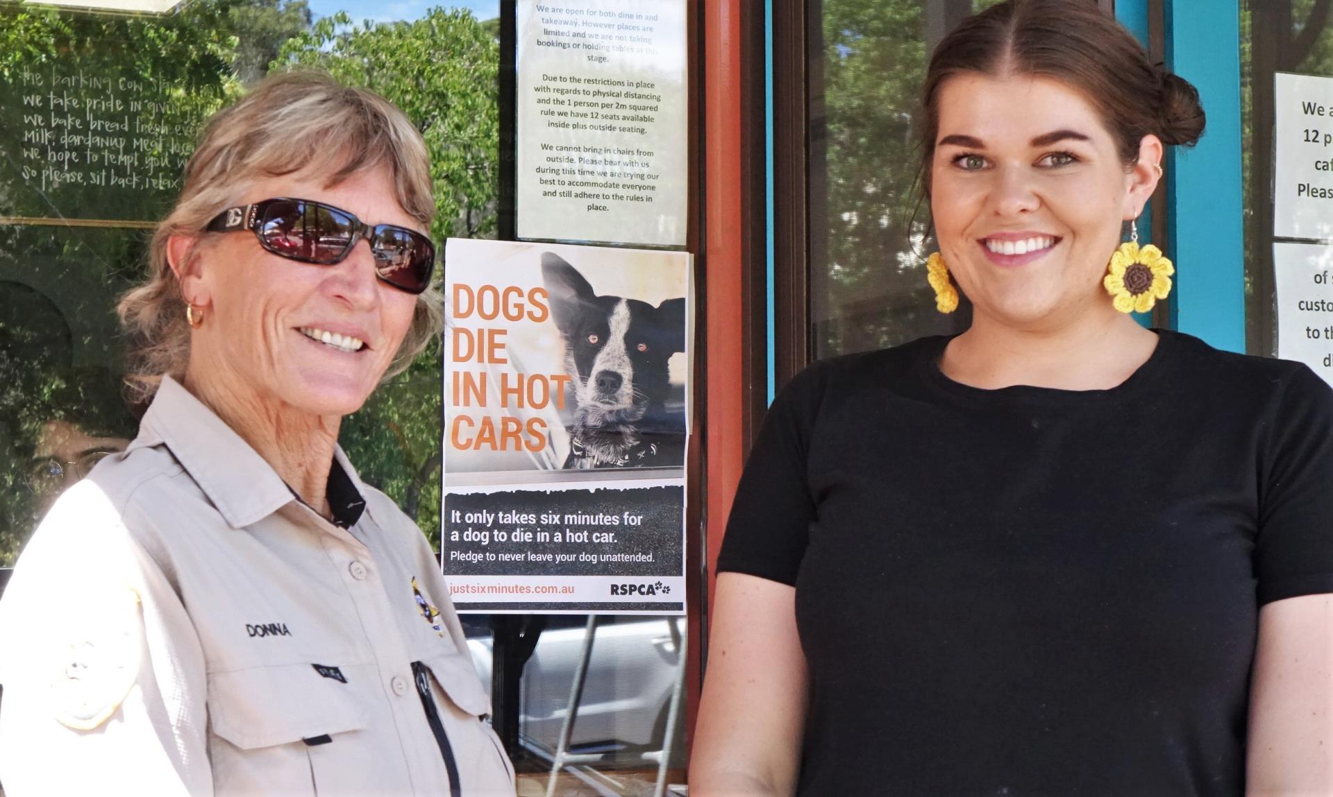 Image: The Shire Ranger with Karli and one of the RSPCA posters at Barking Cow Cafe.